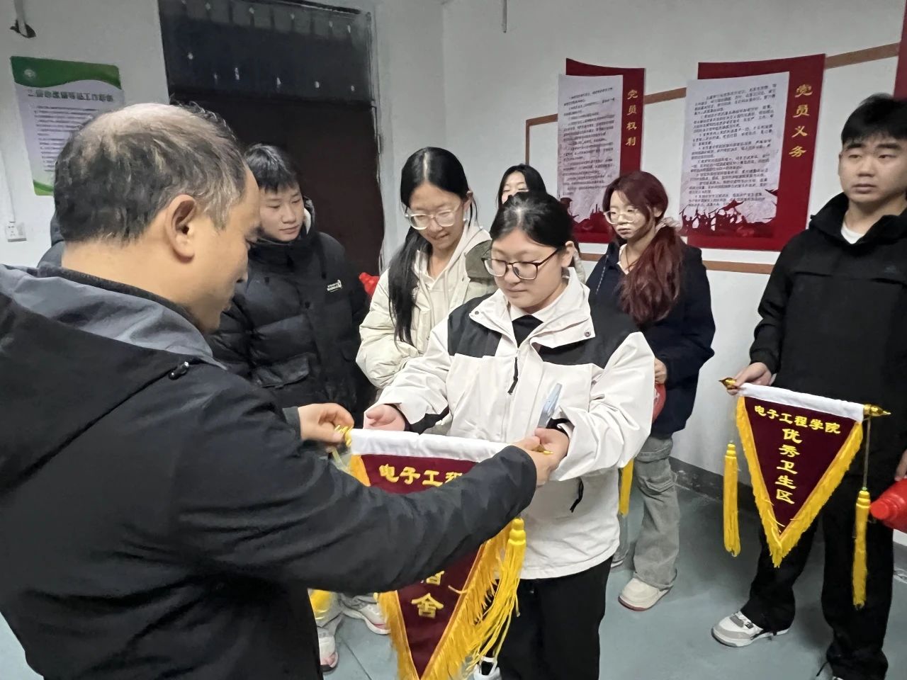 為不斷進(jìn)一步增強(qiáng)電子工程學(xué)院學(xué)子們的衛(wèi)生意識(shí)和文明素養(yǎng),展現(xiàn)良好的校園形象,電子工程學(xué)院于2024年11月25日開展了“流動(dòng)紅旗”評(píng)比活動(dòng)。其中黨總支書記王正偉、學(xué)生支部書記李玲玲對(duì)上周優(yōu)秀宿舍頒發(fā)流動(dòng)紅旗,各班級(jí)班長(zhǎng)、團(tuán)支書、學(xué)院生活部參與本次頒發(fā)儀式
