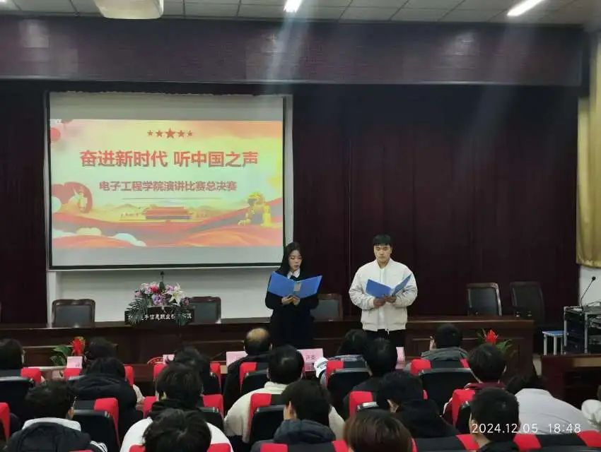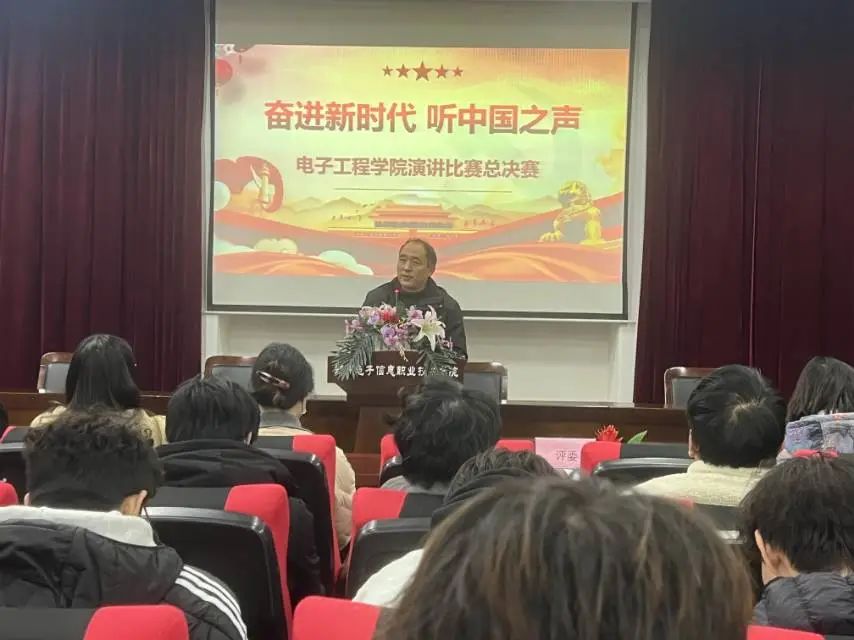 為深入學(xué)習(xí)貫徹習(xí)近平新時代中國特色社會主義思想和黨的二十大、二十屆三中全會精神,推進(jìn)高校鑄牢中華民族共同體意識工作。2024年12月5日,電子工程學(xué)院在圖書館二樓報告廳舉辦“奮進(jìn)新時代,聽中國之聲”主題演講比賽。本次演講比賽由張智賢、段躍武主持,黨總支書記王正偉,學(xué)生黨支部書記李玲玲,教研室主任陳新穎,輔導(dǎo)員代表梁哲、劉蒙蒙,老師代表李一凡、辛國偉,出席活動。