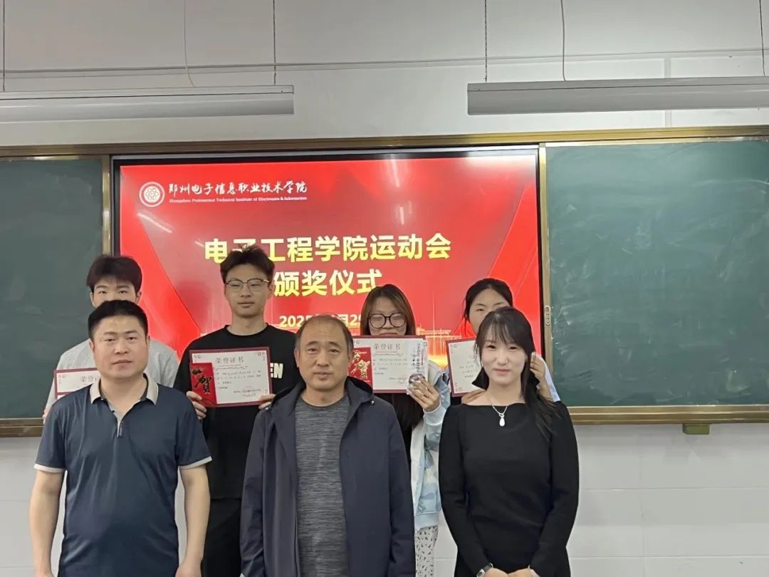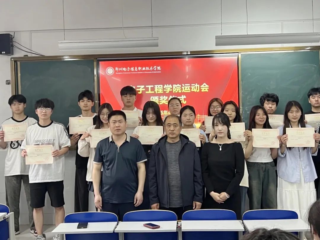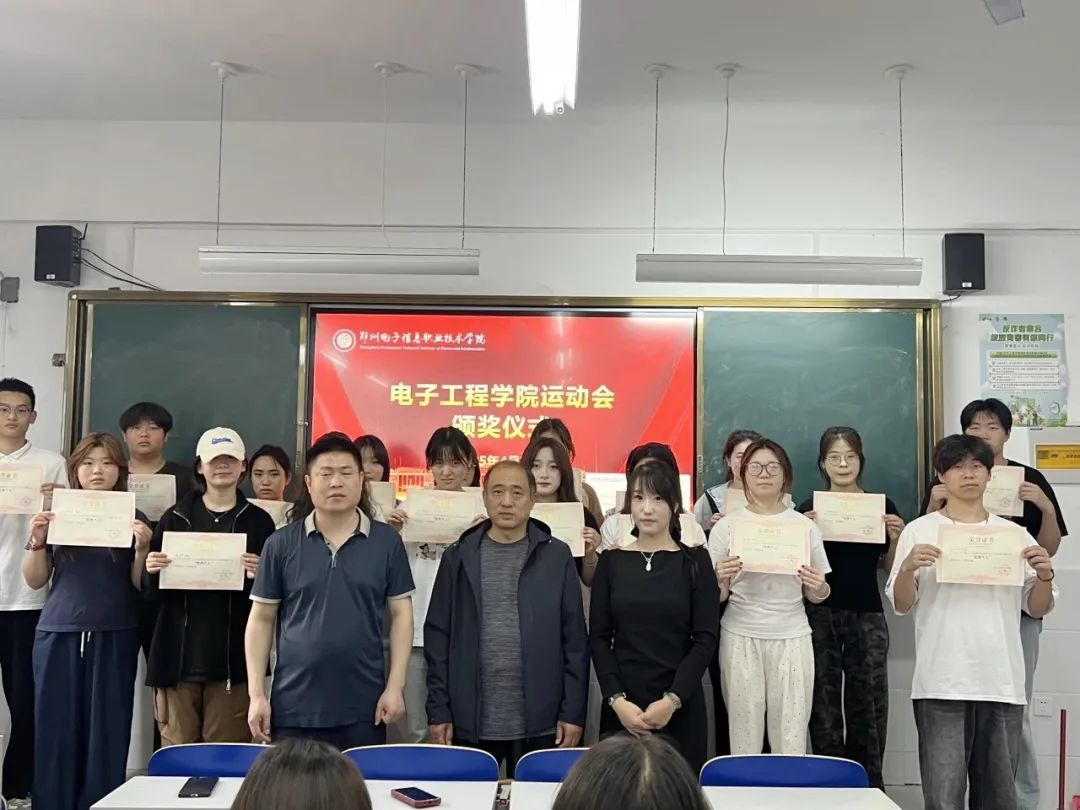 頒獎儀式上,電子工程學(xué)院黨總支書記王正偉、學(xué)生黨支部書記李玲玲、綜合辦公室主任田峰林參與這次頒獎。依次為在運動會中表現(xiàn)出色的運動員們頒發(fā)證書和獎品,表彰他們在賽場上的卓越和表現(xiàn)不懈努力。這些證書不僅是對運動員們個人成就的認可,更是對他們背后團隊協(xié)作和支持的肯定。運動員們臉上洋溢著自豪的笑容,手拿榮譽證書的那一刻,成為他們青春記憶中最閃耀的瞬間。
