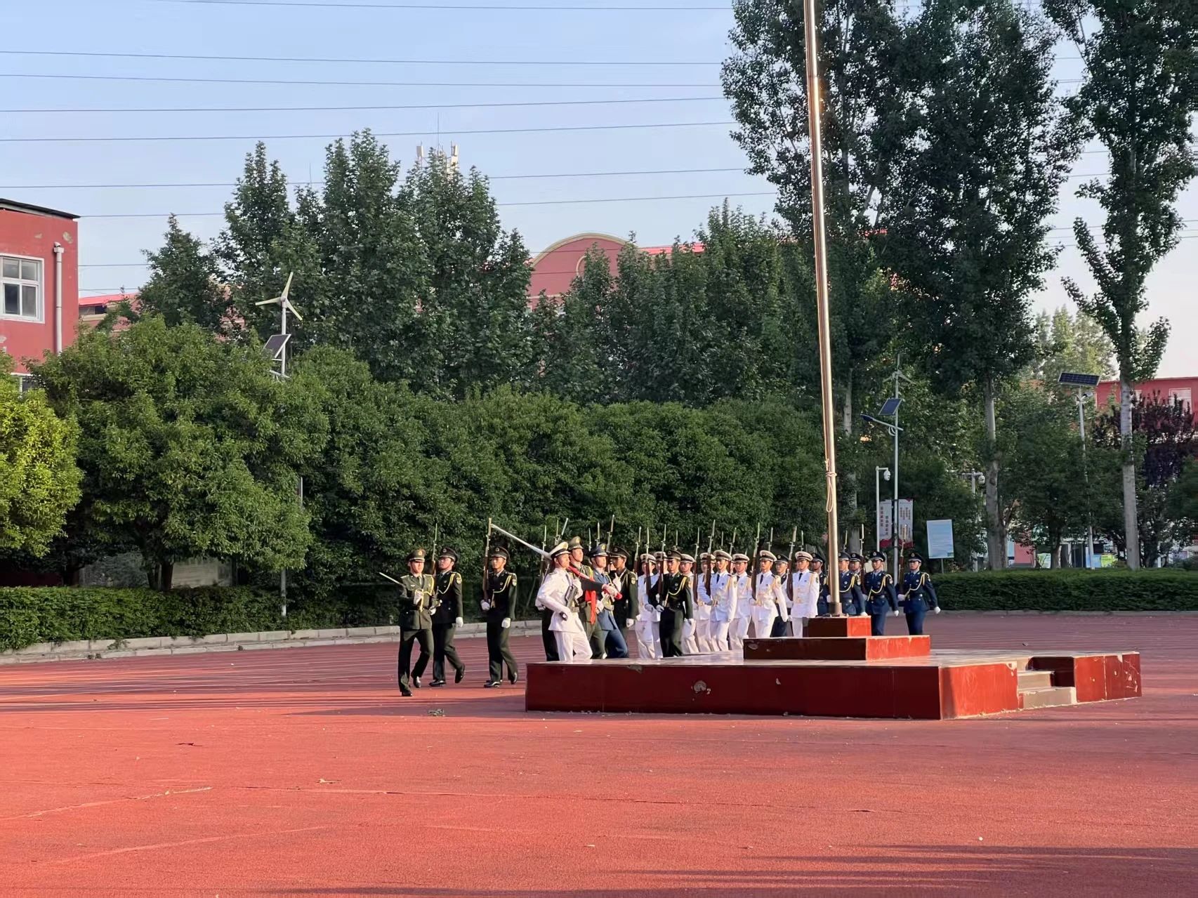 儀式正式開(kāi)始,國(guó)旗護(hù)衛(wèi)隊(duì)隊(duì)員身姿挺拔、精神抖擻,邁著整齊有力的步伐走向升旗臺(tái)。他們動(dòng)作規(guī)范、步伐一致,展現(xiàn)出高度的紀(jì)律性和使命感。隨著激昂的國(guó)歌聲響起,五星紅旗在晨光中緩緩升起,迎風(fēng)飄揚(yáng)。全體師生神情肅穆,目光緊緊追隨著國(guó)旗,心中滿(mǎn)是對(duì)祖國(guó)的熱愛(ài)與崇敬。