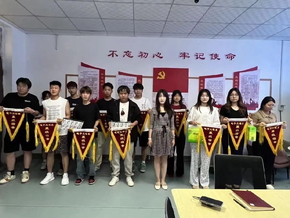 為不斷進一步增強電子工程學院學子們的衛(wèi)生意識和文明素養(yǎng),展現(xiàn)良好的校園形象,電子工程學院于2025年5月19日開展了“流動紅旗”評比活動。其中黨總支書記王正偉、學生支部書記李玲玲對上周優(yōu)秀宿舍頒發(fā)流動紅旗,各班級班長、團支書、學院生活部參與本次頒發(fā)儀式