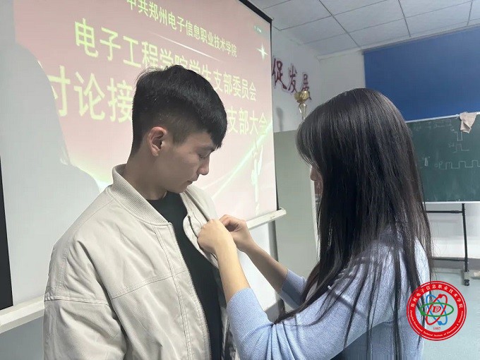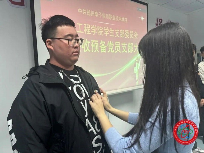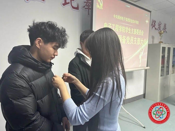 會議最后,預備黨員列隊整齊,學生黨支部書記李玲玲為在場的預備黨員佩戴上黨徽并希望他們:身為黨員要經(jīng)得起考驗,擔當起自己責任,樹立先鋒模范作用,積極參與到實踐中去,投身于為人民服務中去;時刻堅定理想信念,保持謙虛謹慎,不驕不躁。
