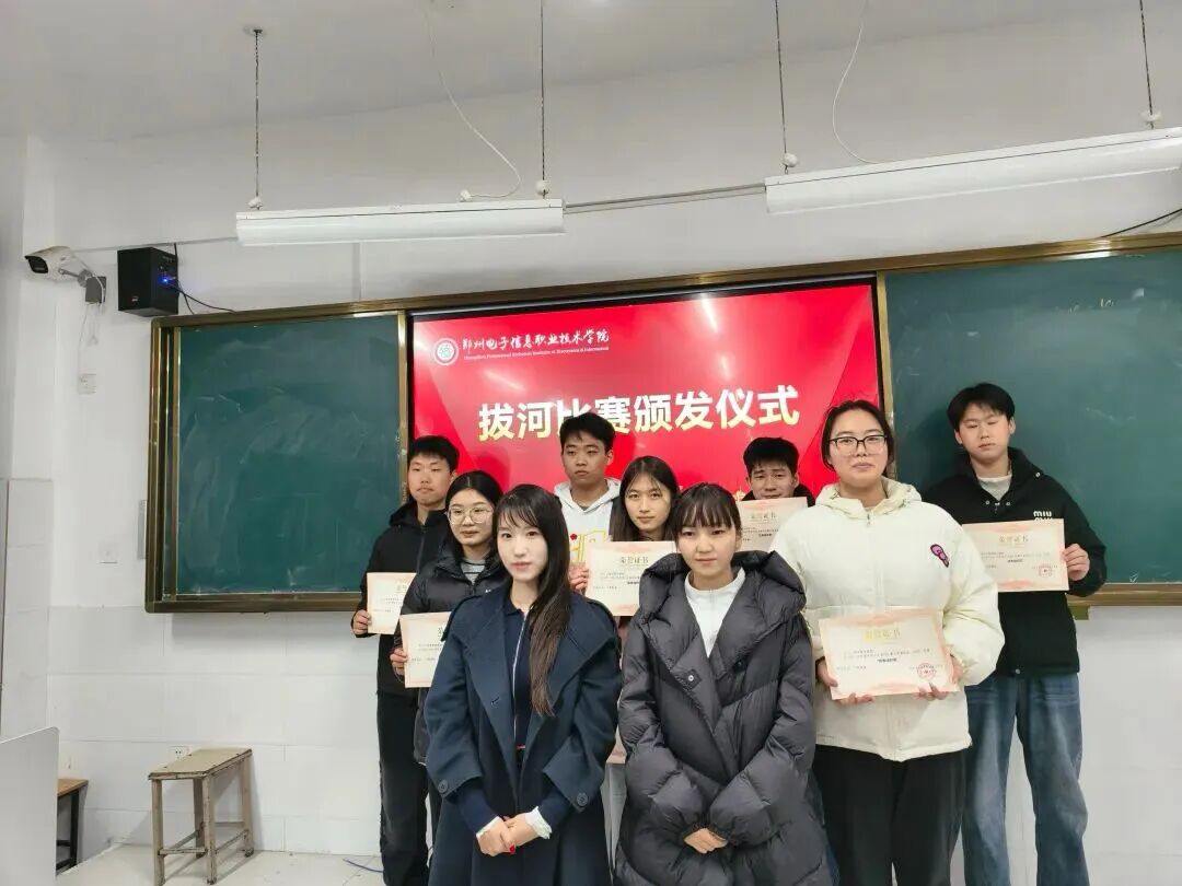 2025年12月15日下午,電子工程學(xué)院在五號樓105舉行了拔河比賽的頒獎(jiǎng)儀式,為優(yōu)秀學(xué)子們的卓越表現(xiàn)進(jìn)行表彰。出席本活動(dòng)的有黨總書記李玲玲、輔導(dǎo)員代表梁哲