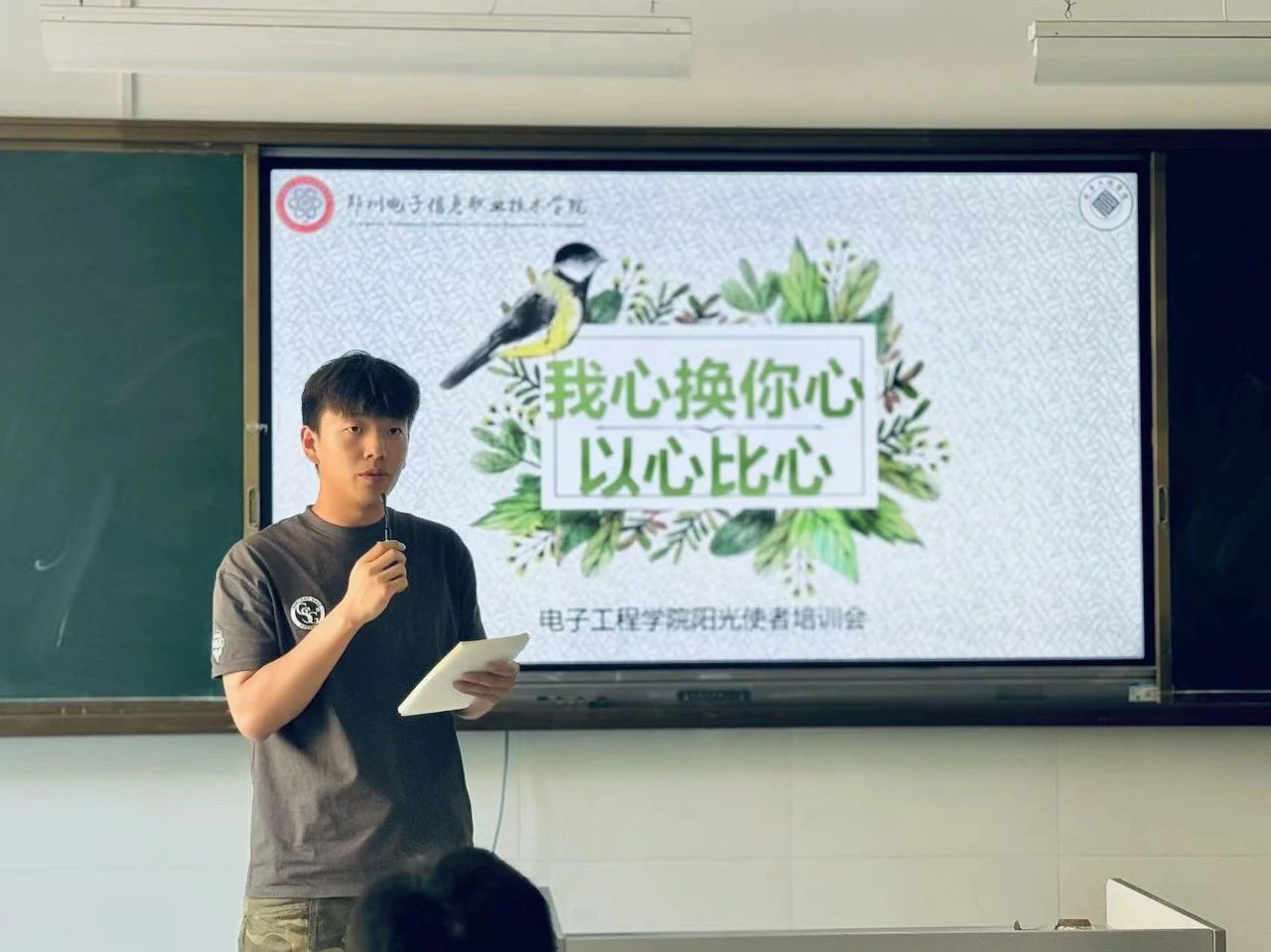 為了進(jìn)一步完善電子工程學(xué)院大學(xué)生心理健康教育體系,提升學(xué)院學(xué)生整體心理素質(zhì)。5月14日下午13點,電子工程學(xué)院開展了“陽光使者”心理健康培訓(xùn)會,對學(xué)生進(jìn)行了心理健康教育培訓(xùn),共有90余名電子工程學(xué)院宿舍心理信息員參與心理健康培訓(xùn)。本次活動主要是在讓同學(xué)們參加培訓(xùn)的過程中,正確的認(rèn)識自己了解自己,關(guān)注自己的心理健康和心靈健康。