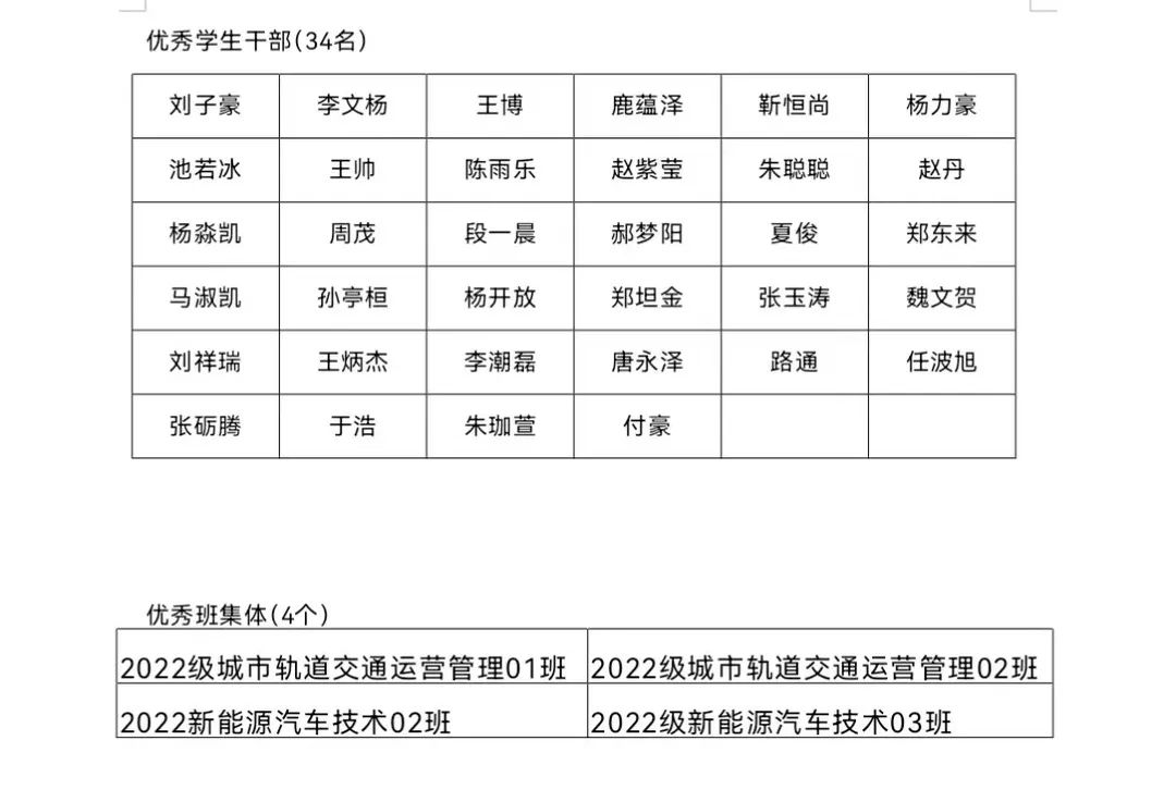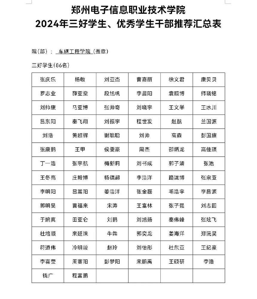 為提高學(xué)生綜合素質(zhì),樹立典型,激勵(lì)學(xué)生勤奮學(xué)習(xí)、健康成長,我院根據(jù)《鄭州電子信息職業(yè)技術(shù)學(xué)院關(guān)于評(píng)選三好學(xué)生、優(yōu)秀學(xué)生干部、先進(jìn)班集體的通知》(鄭電院【2024】038號(hào))文件要求開展2024年度校級(jí)三好學(xué)生、優(yōu)秀學(xué)生干部、先進(jìn)班集體的評(píng)選工作,依據(jù)評(píng)審條件和要求,車輛工程學(xué)院內(nèi)遵循公正、公平、公開的原則經(jīng)個(gè)人推薦、班級(jí)評(píng)選、學(xué)院評(píng)審小組審核,擬推薦三好學(xué)生86名,優(yōu)秀學(xué)生干部34名,先進(jìn)班集體4個(gè)。名單公示如下: