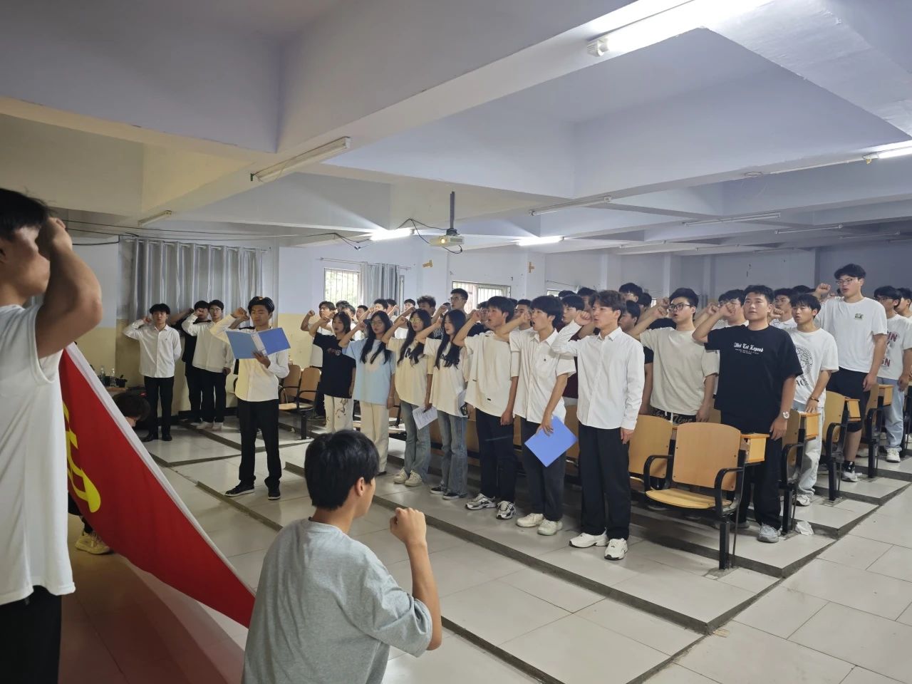 入團儀式在莊嚴的國歌聲中開始,全體新發(fā)展團員肅穆而立,奏唱國歌。